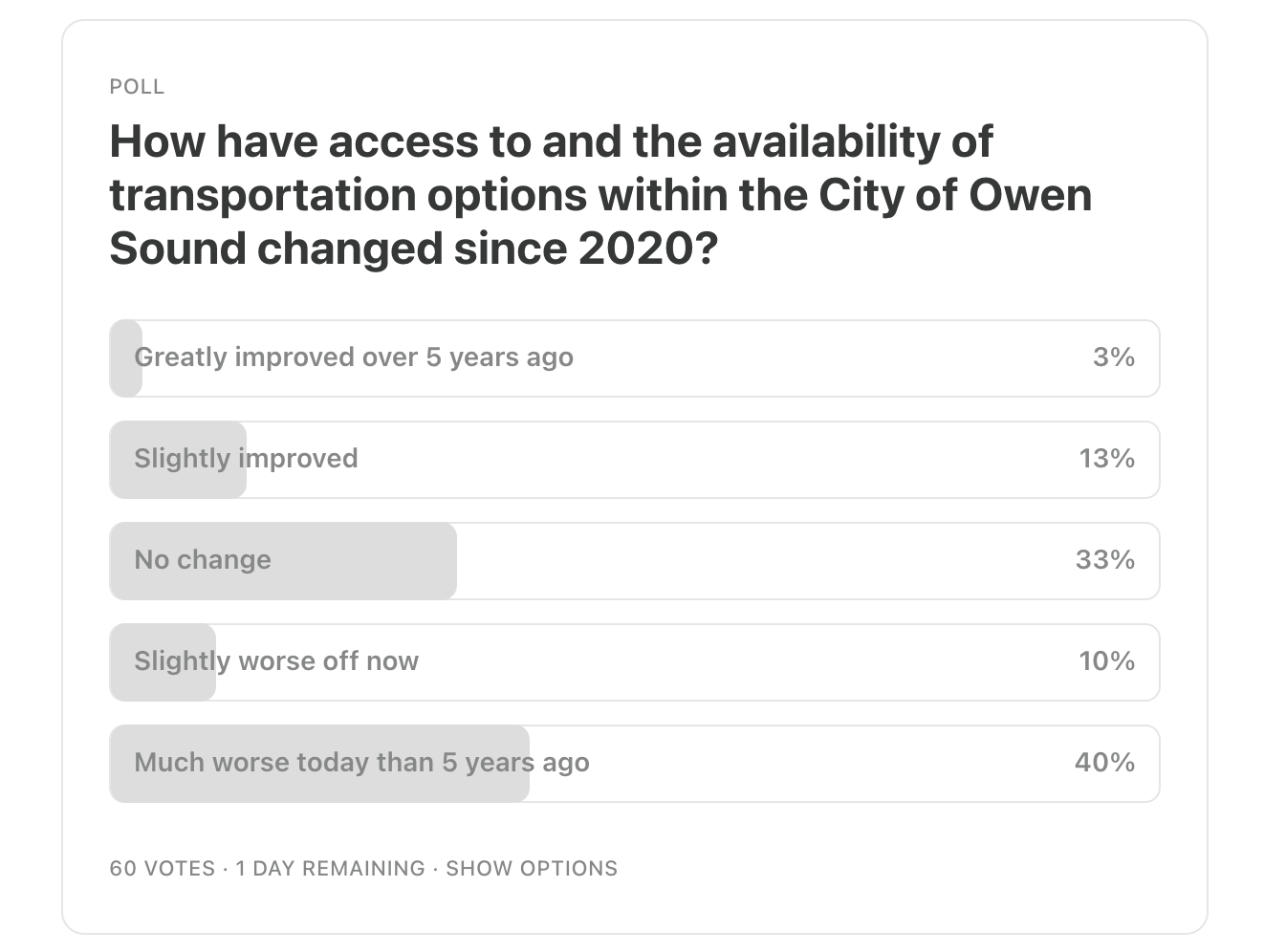 Fully 50% of respondents believe we’re worse off for transportation options than we were in 2020. Another 33% don’t think anything has changed. Just 16% indicated any improvement.