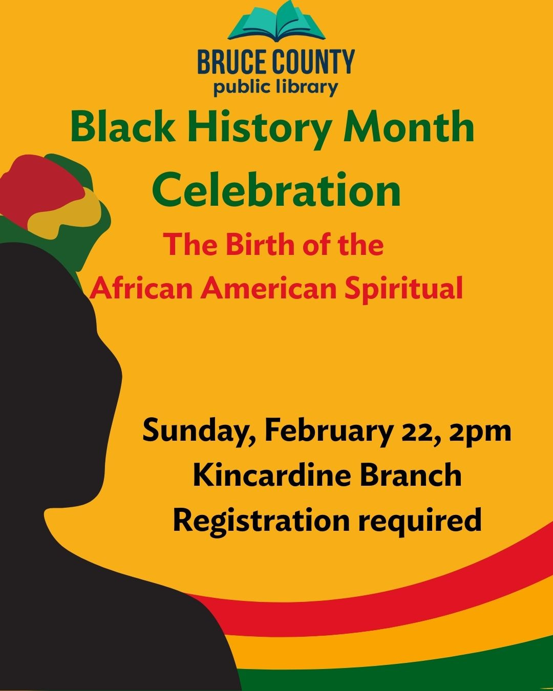 Bruce County Public Library hosts a Black History Month celebration at its Kincardine Branch on Feb. 22, featuring African American spirituals, poetry, and Caribbean cuisine.
