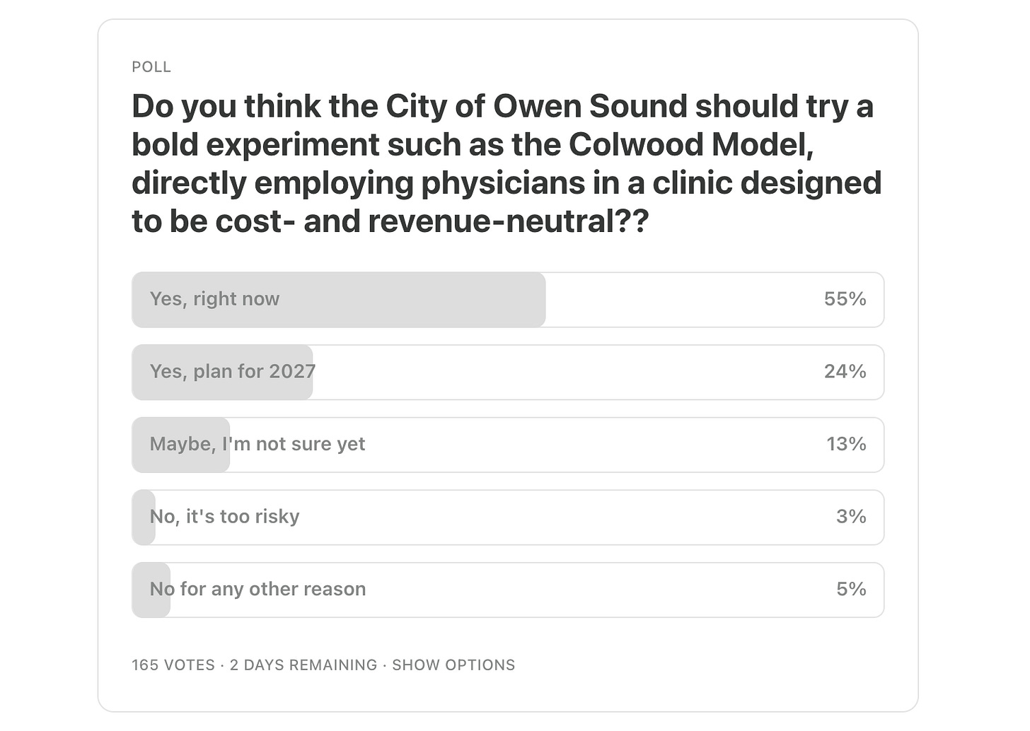 Yesterday, we asked readers whether you felt it was time for the City of Owen Sound to take a different approach to solving the family doctor shortage — specifically by giving the Colwood Model a try.