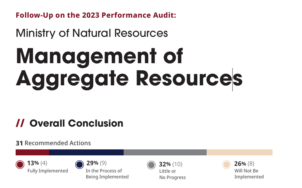 The RGMC says the 2025 follow-up report shows that two years after the Auditor General first flagged serious problems in how the province of Ontario — specifically the Ministry of Natural Resources — oversees gravel mining, most of the 31 recommendations made in 2023 have seen limited or no progress.
