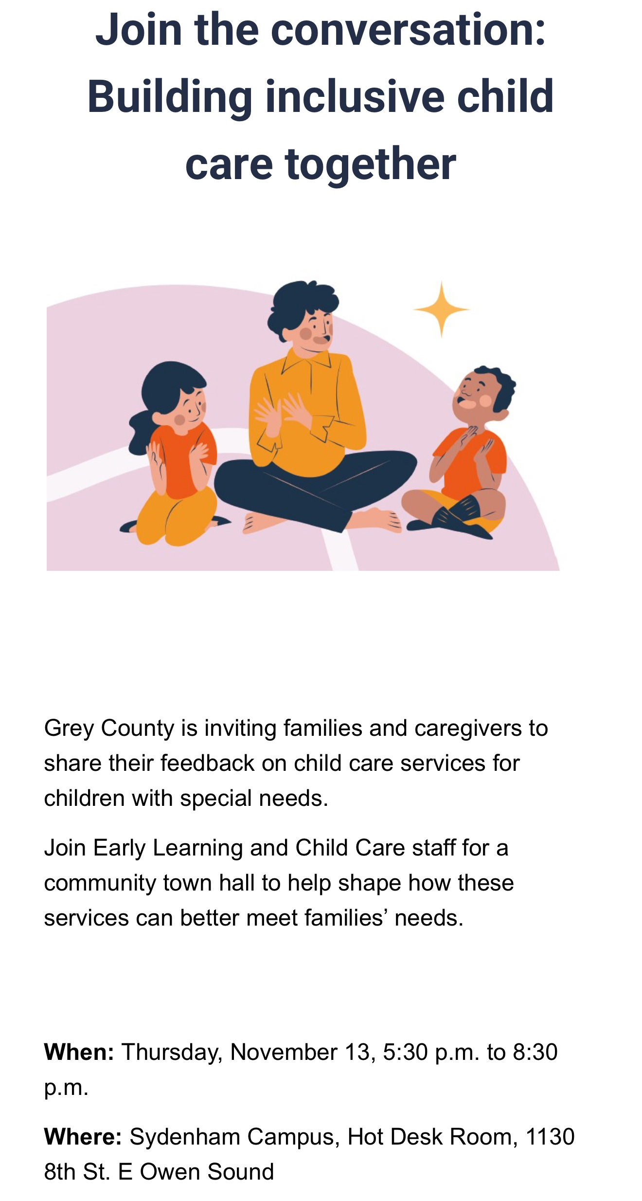 Grey County, as our designated Consolidated Municipal Service Manager, is hosting an Inclusive Child Care Community Conversation on Thursday, November 13, from 5:30–8:30 p.m. at Sydenham Campus (Hot Desk Room), 1130 8th Street East, Owen Sound.