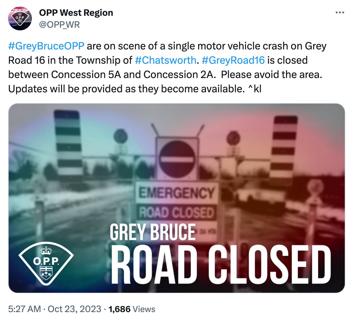 Grey Bruce OPP closed a section of Grey Road 16 this morning following a single vehicle crash in Chatsworth Township and are asking people to avoid the area.