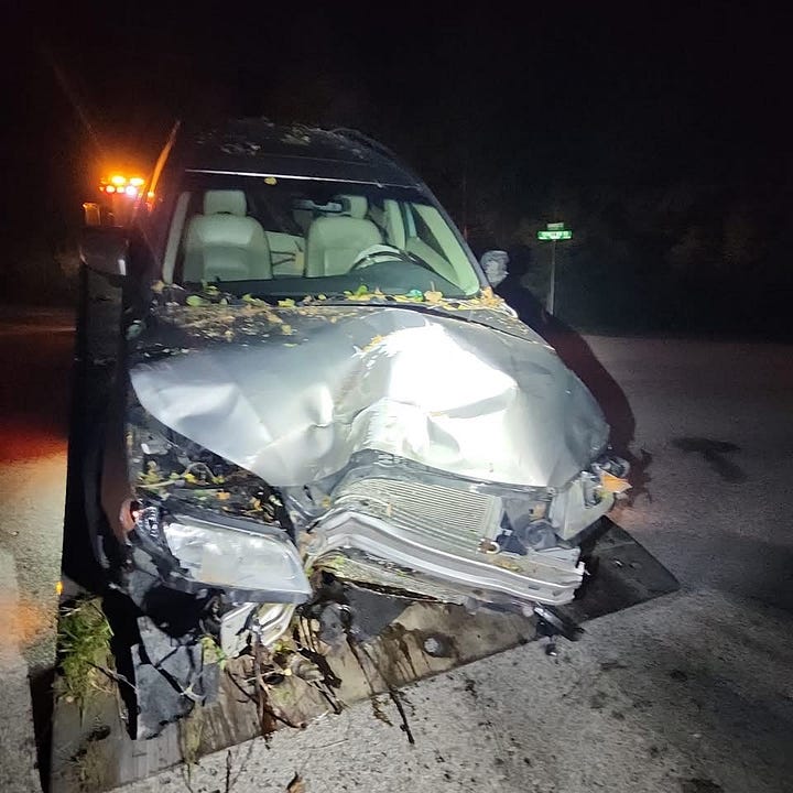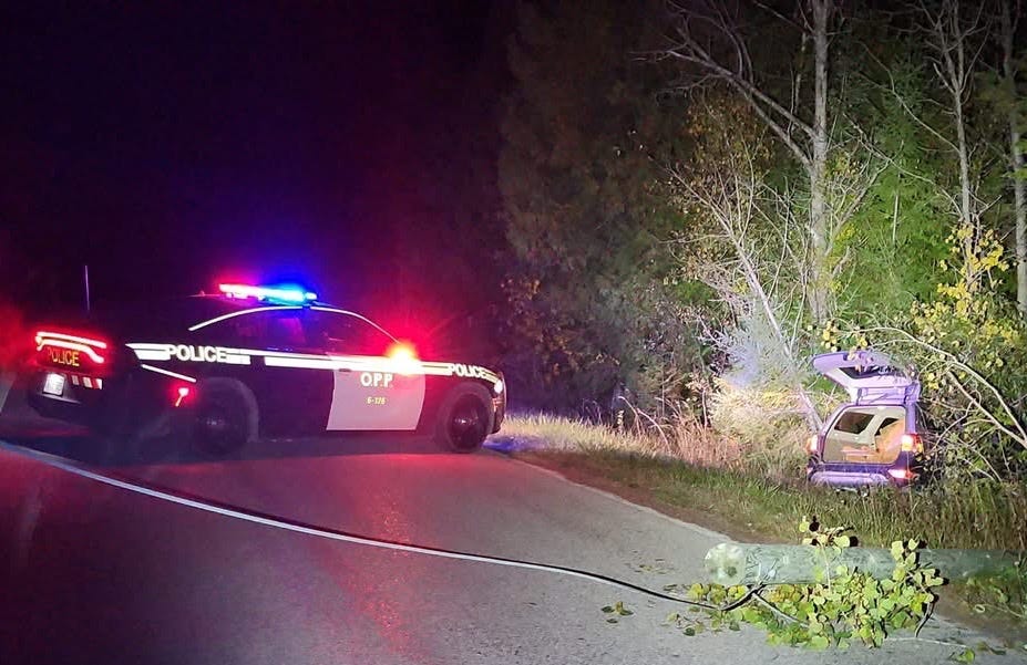 The Grey Bruce Ontario Provincial Police (OPP) responded to the crash on October 13, 2025, at about 8:10 p.m. According to police, the driver swerved to avoid a deer, lost control, and struck a telephone pole. No injuries were reported.