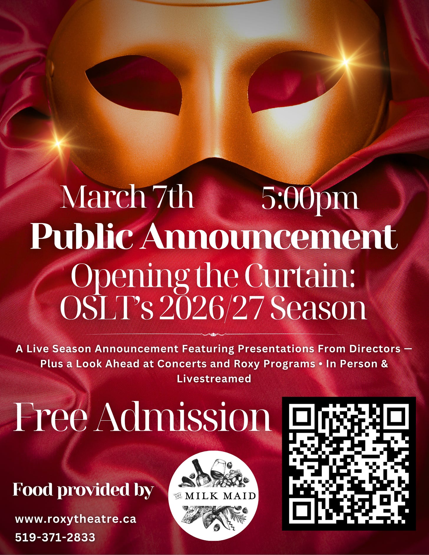 Owen Sound Little Theatre (OSLT) invites the public to a special live event at the Roxy Theatre at 5:00 p.m. on March 7, 2026, where the organization will announce its 2026/27 Season Playbill live for the first time. The free, public event will also feature exciting announcements about upcoming concerts and programs at the Roxy Theatre.