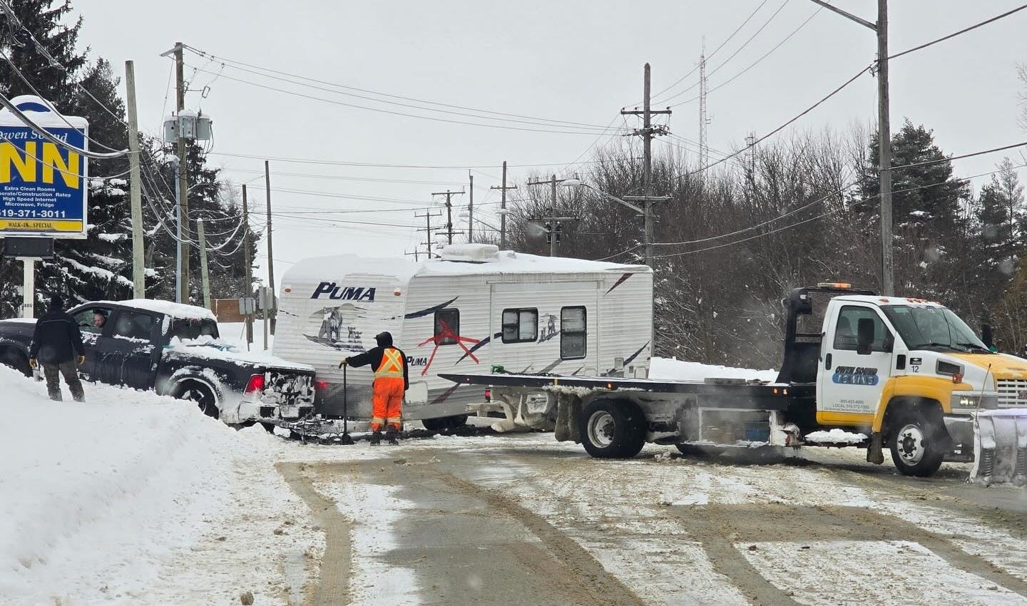 A jackknifed recreational trailer blocked one of the main routes in and out of Owen Sound on New Year's Day.