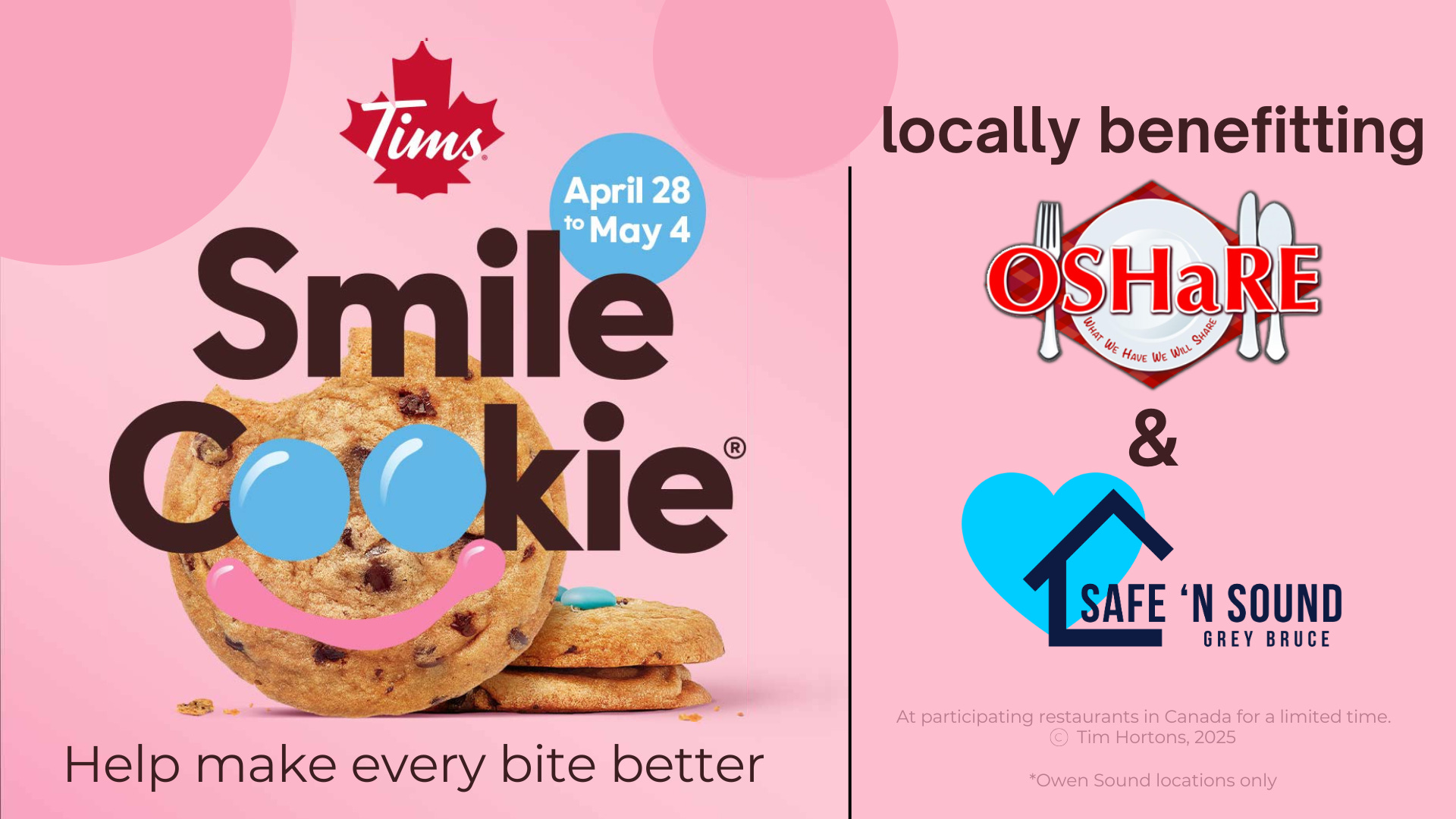 Tim Hortons Smile Cookie Week returns April 28–May 4 in Owen Sound, with all proceeds supporting local charities OSHaRE and Safe ‘N Sound.
