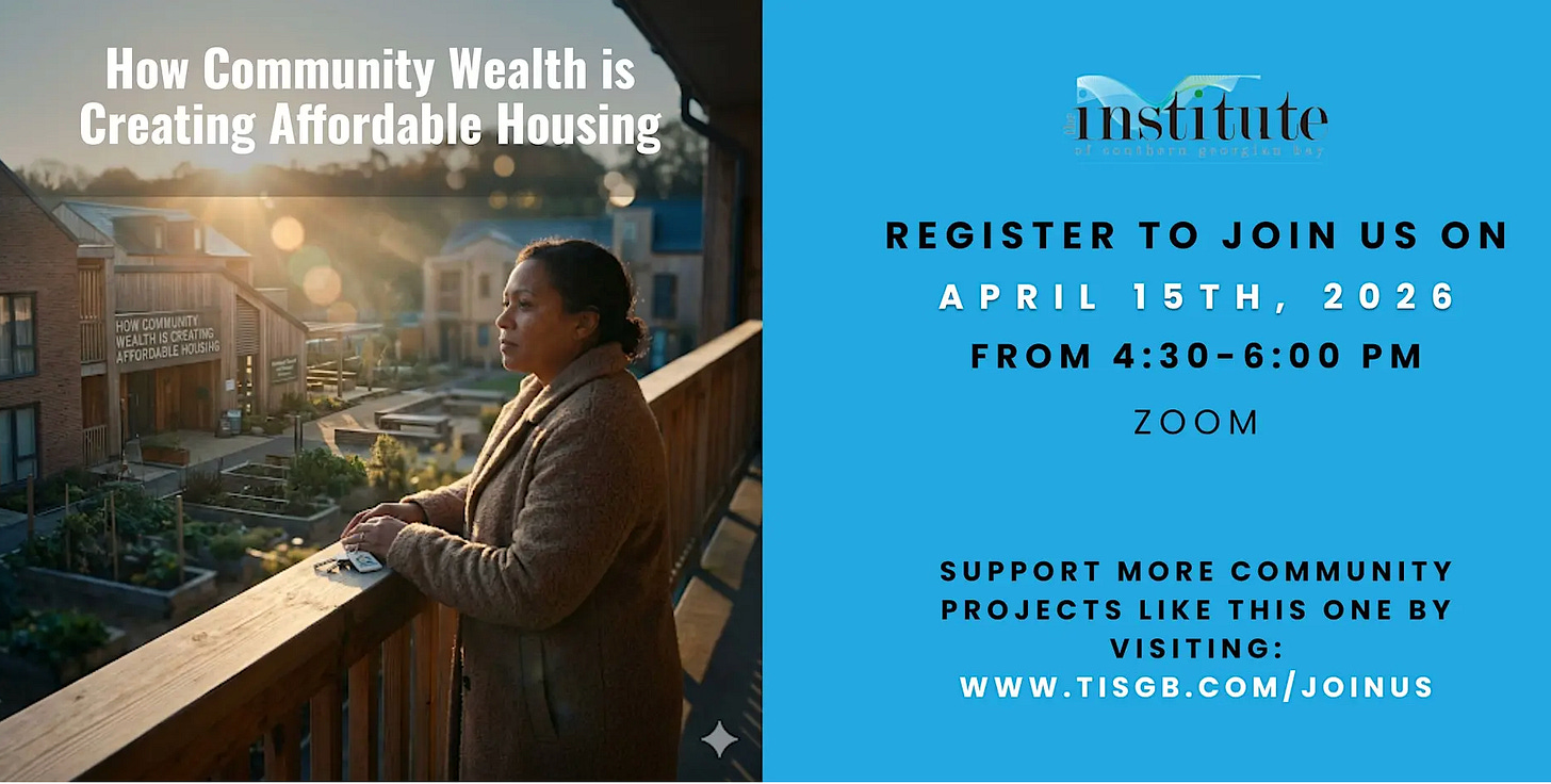 The Institute of Southern Georgian Bay’s Social Finance and Affordable Housing Group continues its online series on community wealth and affordable housing with a talk on April 15, 2026.