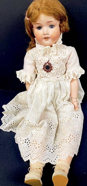 She had a dimpled chin and flaxen or brown ringlets of hair which hung around her neck. The body was made of a wood and flour mixture and jointed at neck, elbows, wrists, hips, knees and ankles. All this for a dollar if it was a 20” doll. A 36” doll could be had for five dollars. A doll like this was the pride of its owner indeed.