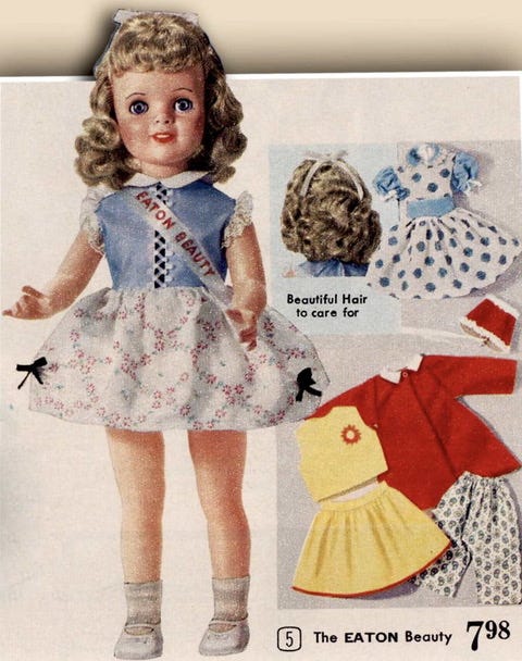 Competition in Toyland became stronger in the 1930s and she lost her Queenly reign to the age of plastic, but the Eaton Beauty will forever remain a bright bit of social history and a nostalgic delight to those of us who grew up in the first quarter of this century. (Extra heads could be bought for this doll also.)