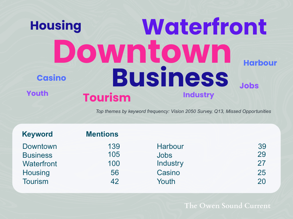 A total of 789 respondents provided answers to this question, offering hundreds of detailed ideas and critiques on how Owen Sound could move forward. Their responses highlight untapped opportunities in waterfront development, downtown revitalization, housing, tourism, and local jobs.