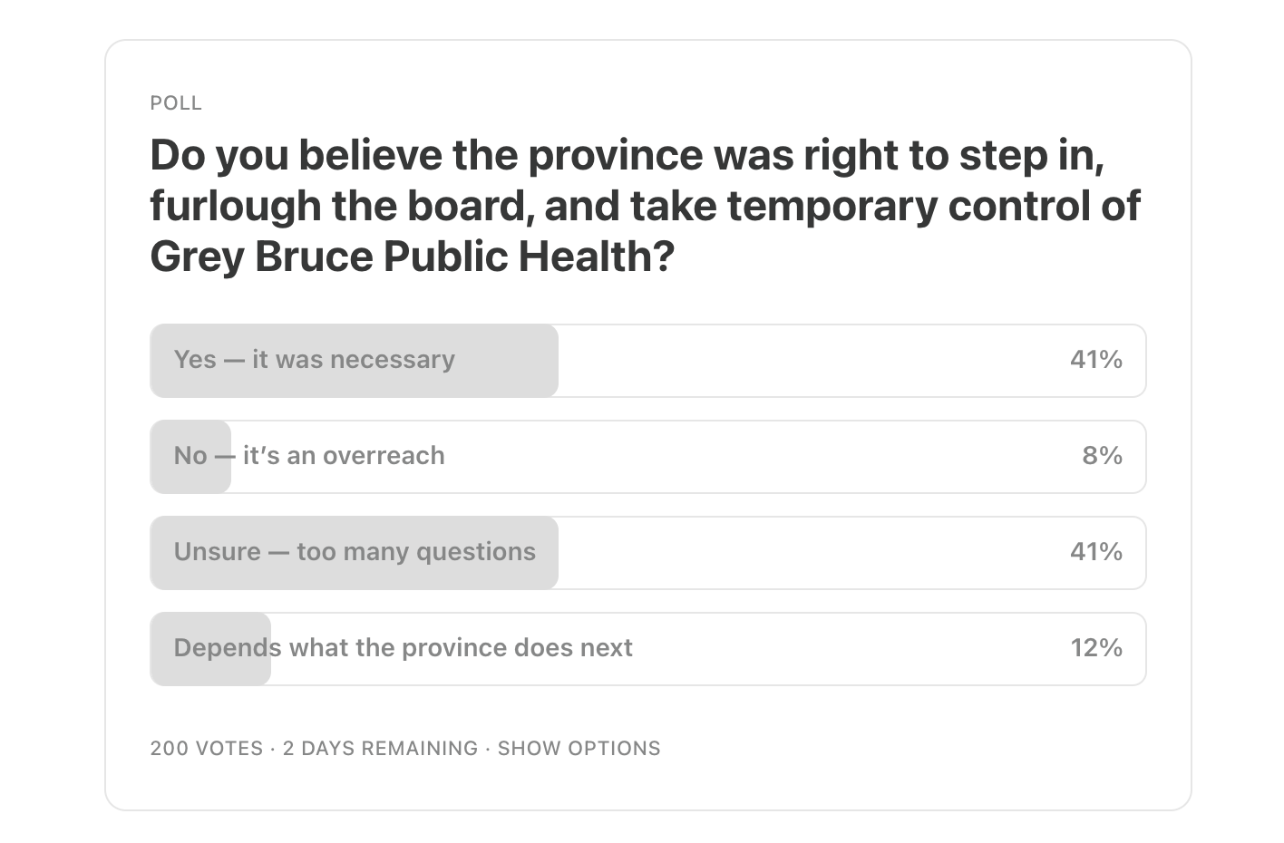 Yesterday, we asked you whether you felt the province was right to step in and assume oversight of Grey Bruce Public Health.