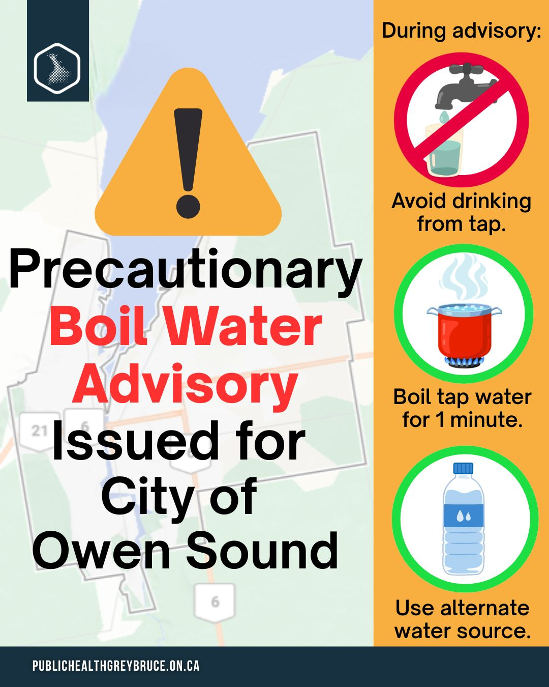 A precautionary boil water advisory remains in effect for everyone using the City of Owen Sound’s municipal water system, including residents in Owen Sound and some nearby areas connected to the system.